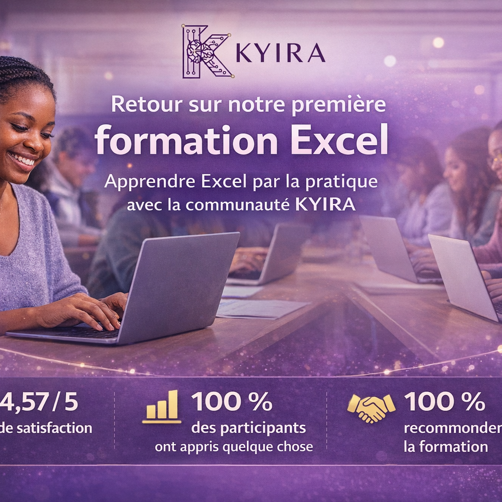 Notre première formation Excel avec KYIRA vient de se terminer… et les retours sont très encourageants. Apprentissage par la pratique, projet concret, échanges avec les participants : cette première expérience a dépassé nos attentes, avec 4,57/5 de satisfaction et 100 % de recommandations. Découvrez le retour complet dans notre article.
